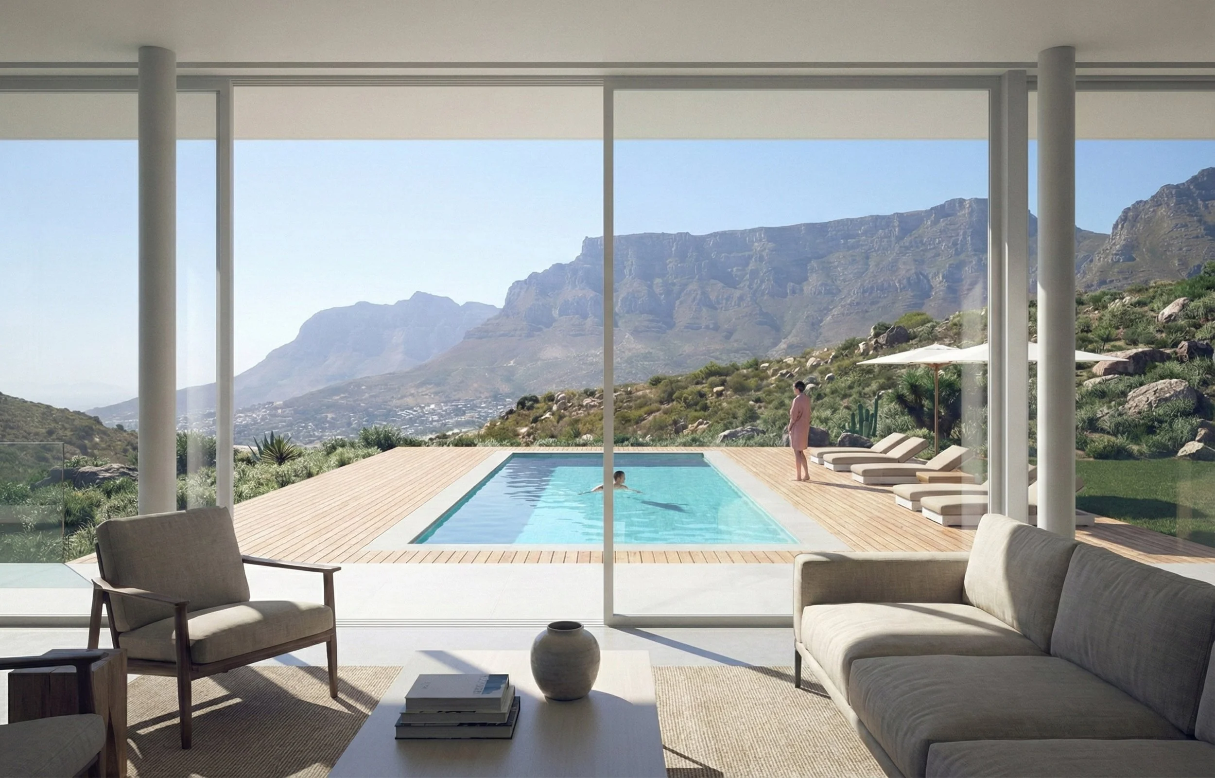 The house is entirely glazed between the two horizontal planes, dissolving the boundary between inside and out. A generous timber pool deck extends from the living space, anchoring the building to the hillside and framing the breathtaking mountain backdrop beyond.